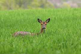 | Wenn im Sommer das Getreide und der Mais schon höher stehen, dann entfernt sich das Rehwild oft weit vom schützenden Wald und ist auf der gesamten Gemarkung zu sehen. Tagsüber ruhen sie in den Feldern und kommen dann gegen Abend und in der Dämmerung auf die Wiesen. Auch im hohen Gras fühlen sie sich relativ sicher und wagen sich auch nah an die Feldwege, die von Menschen stark frequentiert sind. Die Fluchtdistanz ist in dieser Zeit viel kürzer. Dieses Foto entstand bei tiefstehender Sonne nur unweit von der Schleuße Poppenweiler, also direkt am Weg zum Naturschutzgebiet Zugwiesen … |
